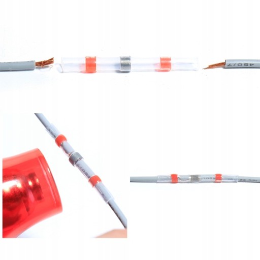 Zestaw zawiera szybkozłączki z cyną wewnątrz rurki termokurczliwej, co zapewnia trwałe i bezpieczne połączenie przewodów. Warstwa kleju wewnątrz szybkozłączki wzmacnia połączenie, chroniąc je przed wilgocią. Cyna topi się podczas podgrzewania, tworząc solidne połączenie kabli.
