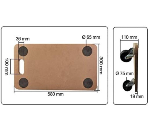 Płyta MDF z 4 antypoślizgowymi punktami zabezpieczającymi Cztery kółka odpowiednie do płytek, betonu, dywanów i PCV, wymiary 580 x 300 x 120 mm