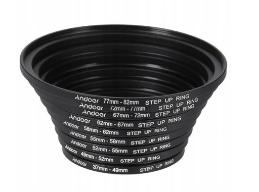 9-częściowy pierścień obniżający: 82-77mm/77-72mm/72-67mm/67-62mm/62-58mm/58-55mm/55-52mm/52-49mm/49-37mm.