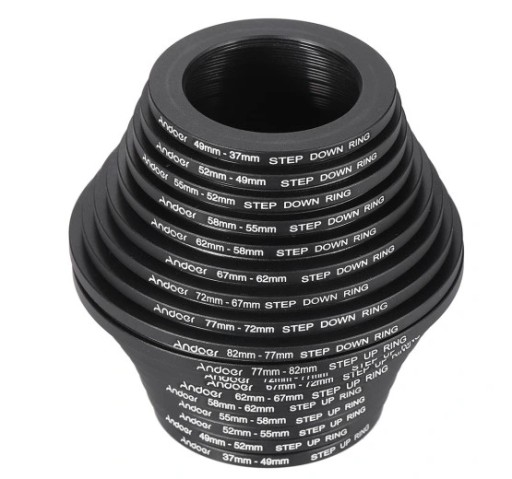 9 sztuk pierścienia podwyższającego: 37-49mm/49-52mm/52-55mm/55-58mm/58-62mm/62-67mm/67-72mm/72-77mm/77-82mm.