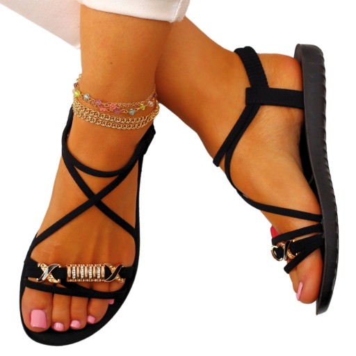 Damskie sandałki w kolorze czarnym, na płaskim spodzie. Idealnie sprawdzą się jako obuwie na co dzień w letnie, upalne dni. Komfortowa, profilowana wkładka sprawia, że idealnie nadają się do codziennego użytkowania. Prosty fason dopasuje się również do eleganckich stylizacji, dodadzą uroku każdej stylizacji. Elastyczny pasek przy pięcie ułatwia zakładanie obuwia i ułatwia jego dopasowanie do stopy.