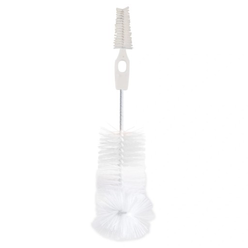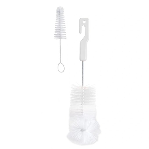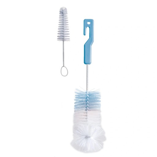 Praktyczny zestaw szczotek ułatwia dokładne mycie wnętrza butelek i smoczków. Włosie szczotek wykonane jest ze specjalnego włókna, które nie rysuje powierzchni. Większa szczotka wyposażona jest dodatkowo w gąbkę, która umożliwia dokładniejsze czyszczenie dna butelki. Mniejsza nadaje się do czyszczenia smoczka z resztek mleka lub kaszki.