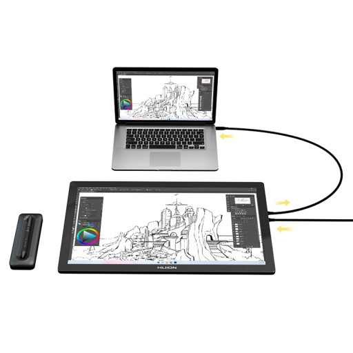 Tablet graficzny Huion Kamvas Pro 19 posiada wbudowane porty USB Typu C. Pozwalają one na ładowanie komputera przenośnego z mocą do 40 W. Sam tablet graficzny dostarczany jest z 65 W, kompaktowym zasilaczem wykonanym w technologii GaN.