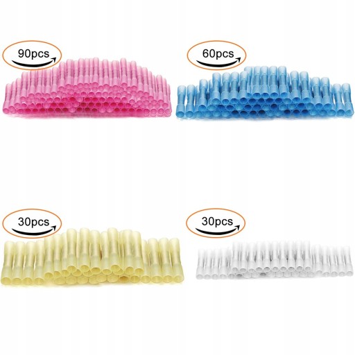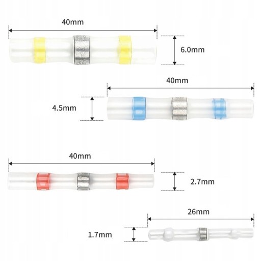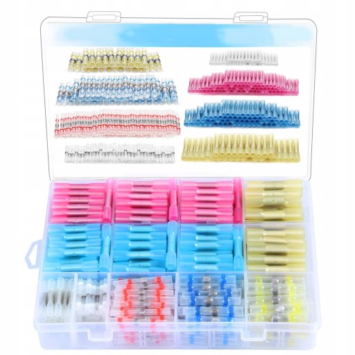 - 120 szt. termokurczliwych złączy lutowniczych w czterech różnych rozmiarach i kolorach, dla kabli o wymiarach od 0,25 do 6,0 mm².