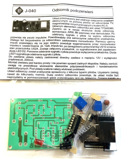 Odbiornik zdalnego sterowania (włącz-wyłącz) współpracujący z dowolnym pilotem na podczerwień. Zasięg ok. 5m.