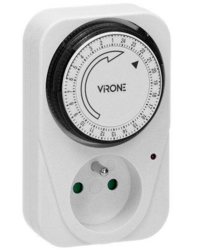 Mechaniczny programator czasowy Virone MT-1 umożliwia ustawienie czasu włączania i wyłączania urządzeń elektrycznych (np. oświetlenia, ogrzewacza wody, reklamy itp.). Posiada 2 tryby pracy: ON / AUTO. Może włączać/wyłączać napięcie w gniazdku do 48 razy dziennie. Minimalny czas włączenia/wyłączenia to 15 min (1 zapadka).