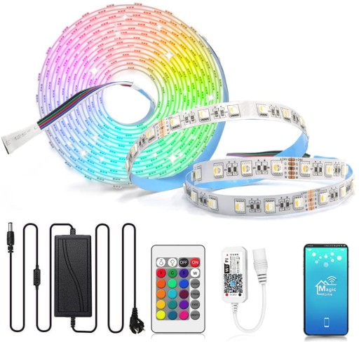 Opakowanie zawiera taśmę LED RGBW 4 w 1 o długości 5 m, zasilacz 24 V, sterownik WiFi, pilot (częstotliwość radiowa 2,4 G), instrukcję obsługi (przeczytaj przed montażem).