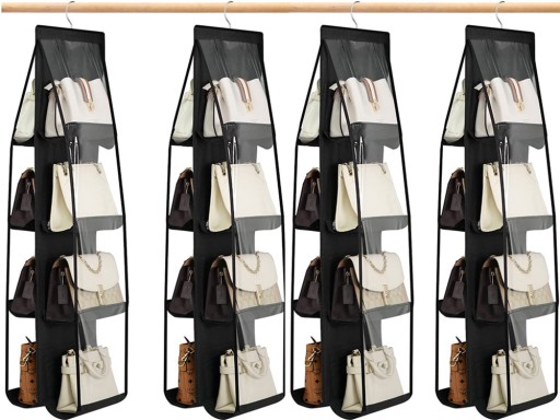Organizer posiada 8 przezroczystych kieszeni, w których możesz pomieścić nawet do 16 torebek. Dodatkowo w zestawie znajduje się metalowy wieszak do zawieszenia.