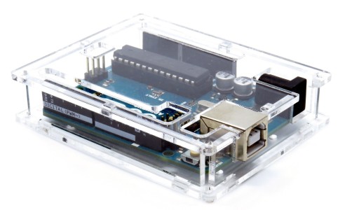 Obudowa kompatybilna z Arduino Uno. Wykonana została z przezroczystego tworzywa sztucznego i jest zamknięta ze wszystkich stron. Ma otwieraną klapkę w górnej części oraz wycięcia na wszystkie złącza znajdujące się na płytce. Umożliwia montaż Shieldów. Obudowa składana jest za pomocą śrub dołączonych do zestawu.