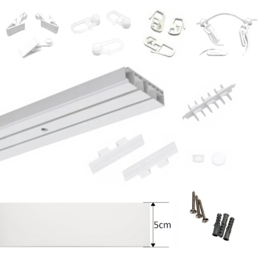 - Szyna 2 torowa w kolorze białym o długości 520 cm (2x 170cm, 1x 180cm) Karnisze o długości do 250 cm dostarczamy w całości, a powyżej 250 cm w częściach
