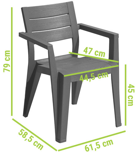 Krzesło ogrodowe JULIE doskonale nadaje się do użytkowania na świeżym powietrzu. Jest bardzo odporne na warunki pogodowe i wykonane z solidnego tworzywa, co gwarantuje trwałość i stabilność.