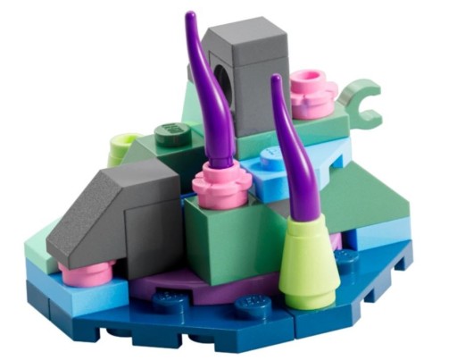 - Co jest w pudełku? – Wszystko, czego potrzeba do zbudowania ruchomej figurki skimwinga, minifigurki Tonowariego i Jake’a Sully’ego, sceneria rafy koralowej Pandory oraz podstawka do ekspozycji