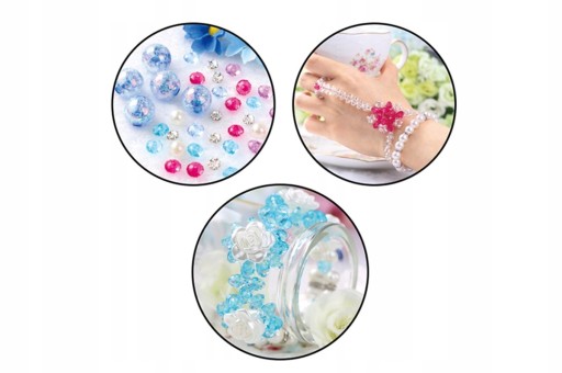 - Zawartość zestawu: koraliki w różnych kształtach i kolorach, elastyczna żyłka do nawlekania