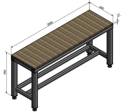 Masywny stół roboczy z profili aluminiowych, z regulowanymi nogami przegubowymi, z blatem dębowym 27mm.