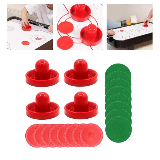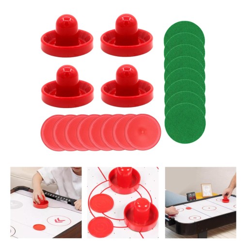 Pakiet zawiera: 4 popychacze do hokeja na powietrzu, 8 zielonych podkładek, 8 pneumatycznych