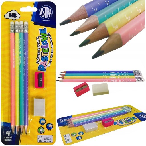 Ołówki szkolne z gumką pastelowe 4szt. HB gumka i temperówka Astra