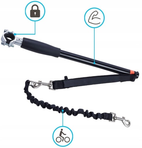 ✔️ Regulowany zaczep do sztycy rowerowej, mocny pasek oraz karabińczyk do obroży psa, gwarantujące pełną kontrolę i komfort użytkowania.