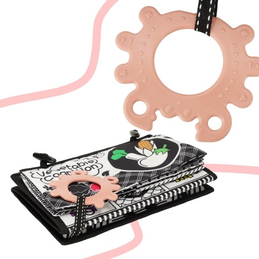 Jedną z części książeczki stanowi bezpieczne lusterki, które bez wątpienia zaciekawi maluszka. Oprócz tego w zestawie znajduje się również gryzak!