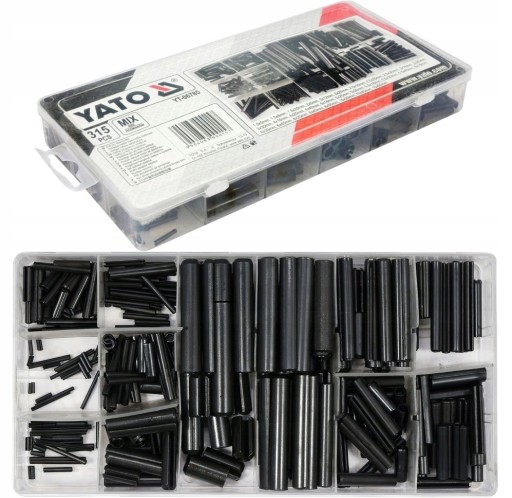 Zestaw 315 sztuk kołków sprężystych/rozprężnych. Zestaw zawiera rozmiary od 1.5x5 mm do 10x50 mm. Całość umieszczono w wygodnym opakowaniu typu "sortownik".