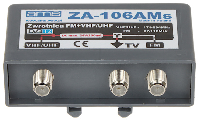 ZA-106AMS umożliwia przesłanie zasilania DC max. 24V/250mA do zasilenia wzmacniacza montowanego w puszce anteny (zasilanie możliwe jest w gałęzi VHF/UHF)