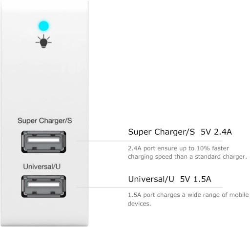 - Interfejs: 1 porty ładowania USB 5 V / 1 A; 1 port USB 5 V / 2,1 A , inteligentne ładowanie
