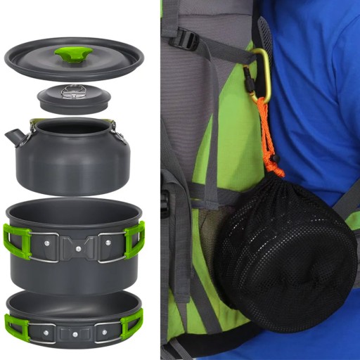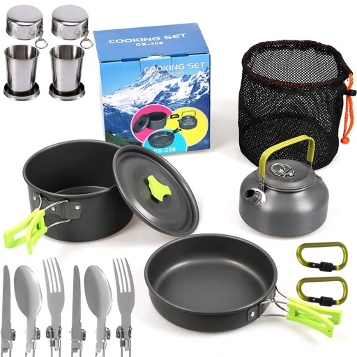 ➡️Wszechstronność i Wygoda: Zestaw zawiera garnek, czajnik, patelnię, dwa kubki, dwa komplety sztućców oraz woreczek do przechowywania, co umożliwia przygotowanie pełnowartościowych posiłków na świeżym powietrzu.