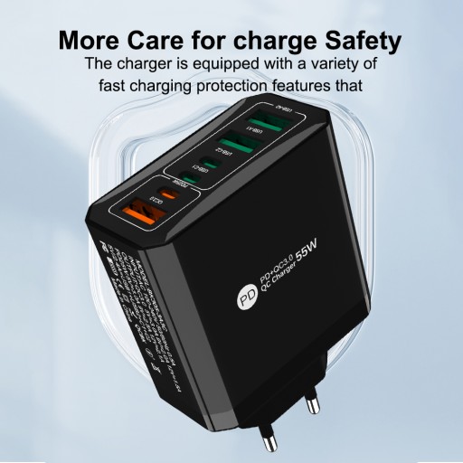 MOCNA SZYBKA UNIWERSALNA ŁADOWARKA SIECIOWA 55W PD+QC 3.0 USB x3 + USB-C x3