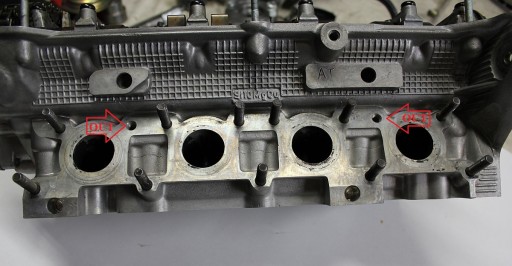 Instalacja zestawu wymaga wykręcenia dwóch niepotrzebnych szpilek z głowicy (zaznaczone na foto) oraz nacięciu kilku nowych szliców w kolektorze wydechowym pod szpilki (szablon ułatwiający dokonanie operacji w zestawie).