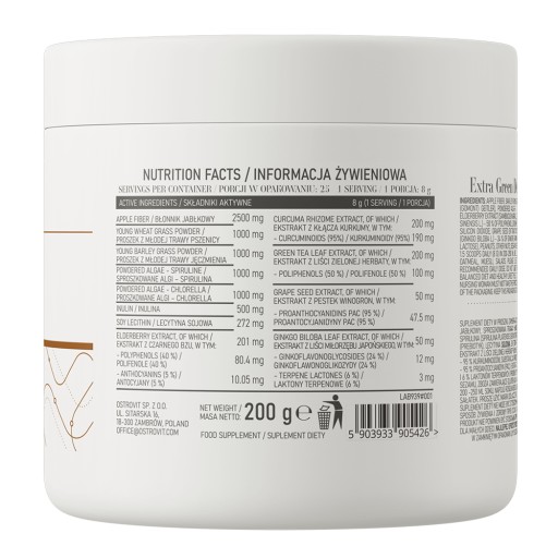 Składniki: błonnik jabłkowy, sproszkowana trawa młodego jęczmienia, sproszkowana trawa młodej pszenicy, sproszkowane algi - spirulina (Spirulina platensis (Gomont) Geitler), sproszkowane algi - chlorella (Chlorella pyrenoidosa), inulina z cykorii (prebiotyk), lecytyna sojowa, ekstrakt z czarnego bzu (Sambucus nigra L.) - 40 % polifenoli oraz 5 % antocyjanów, ekstrakt z liści zielonej herbaty (Camellia sinensis L.) - 50 % polifenoli, ekstrakt z kłącza kurkumy (Curcuma longa L.) - 95 % kurkuminoidów, substancja przeciwzbrylająca: dwutlenek krzemu; ekstrakt z pestek winogron (Vitis vinifera L.) - 95 % proantocyjanidyn (PAC), ekstrakt z liści miłorzębu japońskiego (Ginkgo biloba L.) - 24% ginkoflawonoglikozydów i 6% laktonów terpenowych.