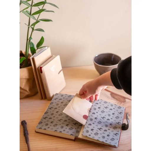 Twarda skórzana okładka, zadrukowana fotografią o intensywnych i wyrazistych barwach.Zeszyt posiada 120 kropkowanych kartek, jest zamykany na kolorową gumkę.Notes posiada w zestawie długopis stylizowany na różdżkę Harry'ego Pottera.Na każdej z kartek umieszczona jest grafika związana z głównym motywem.