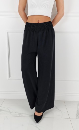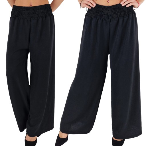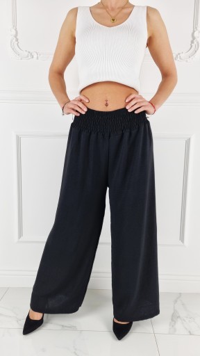 Szerokie spodnie damskie to niezbędny element damskiej garderoby. W pasie mają elastyczną gumę, która świetnie je podtrzymuje, a jednocześnie nie uciska. Model jest wyjątkowo wygodny, zapewnia maksymalny poziom komfortu. Materiał świetnie układa się na sylwetce, nie opina, nie prześwituje. Świetnie nadają się do tworzenia zarówno eleganckich, jak i casualowych stylizacji.