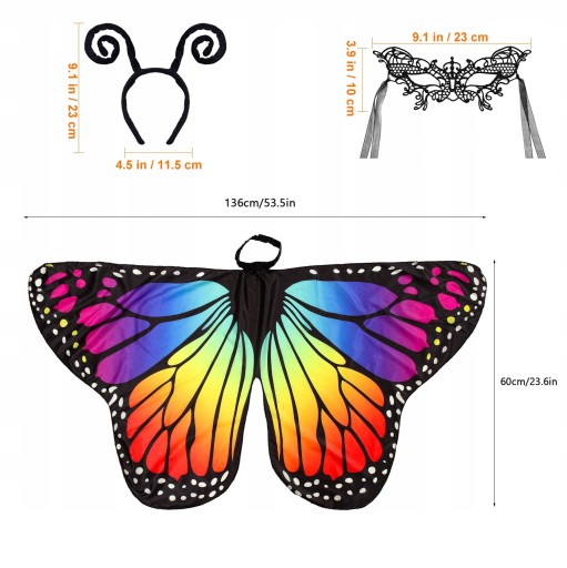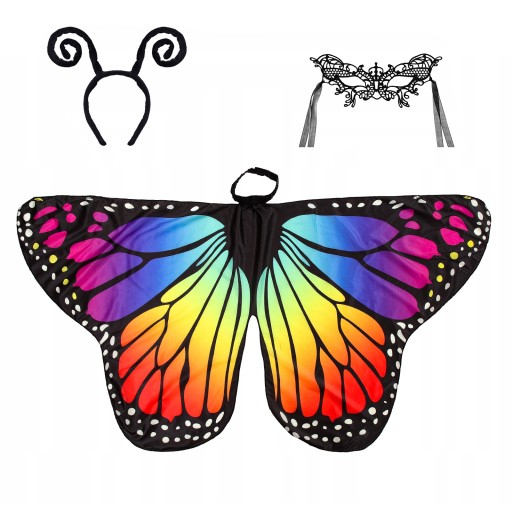 Jest to zestaw dla dzieci: Peleryna w kształcie skrzydeł motyla, koronkowa maska i opaska na głowę.
