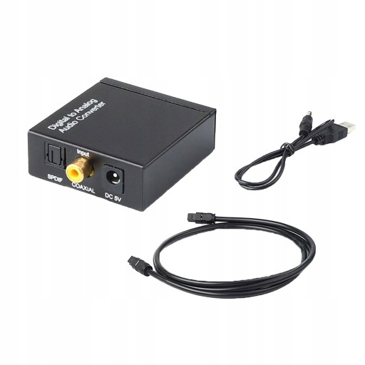 Złącze wejściowe audio: 1 x Toslink, 1 x RCA (koncentryczny); Wyjściowe złącze audio: 2 x RCA (R / L), 1 x gniazdo 3,5 mm; Zasilany przez kabel zasilający USB 5,5 mm;