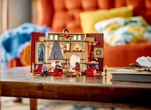 - Autentyczne detale – flaga przedstawia herb Gryffindoru™ i otwiera się, ukazując zbudowany z klocków pokój wspólny, w tym kominek, siedzenia i świece na świecznikach oraz szachownicę