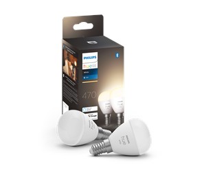 Żarówka kulka Hue White, 5,7W (odpowiednik 40W), oprawka E14, kształt żarówki luster P45, 2700 K, 470 lm, żywotność do 25 000 godzin, sterowanie za pomocą inteligentnych urządzeń poprzez podłączenie do mostka Hue (sprzedawany oddzielnie) lub przełącznika Hue Dimmer Switch, sterowanie głosowe za pomocą Google Home, Alexa lub Siri, 2 szt. w opakowaniu.