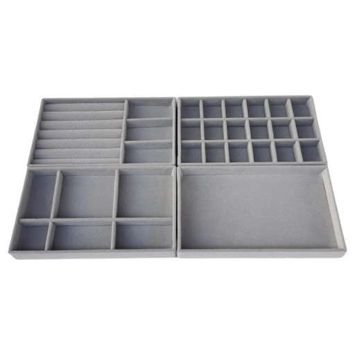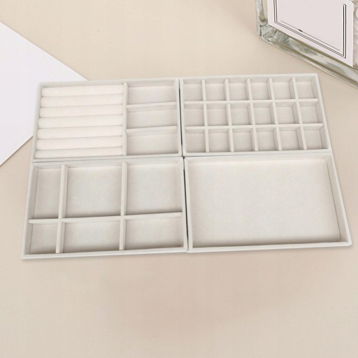 Zestaw 4 organizerów na biżuterię: Ten zestaw tacek na biżuterię jest dostarczany w 4 tacach o różnych układach, w tym pierścionki, taca z 6 kratkami, taca z 18 kratkami z 1 przegródką