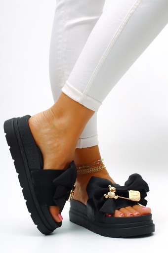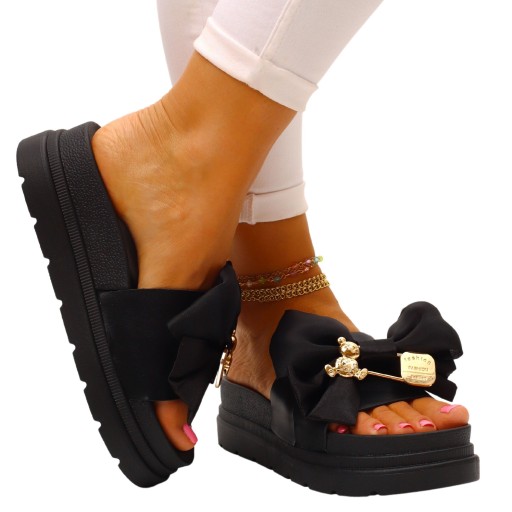 Kapki damskie w kolorze czarnym z kokardą, idealne na każdą okazję. Miękka podeszwa zapewnia komfort noszenia przy codziennym użytkowaniu. Wykonane z wysokiej jakości materiałów, są wygodne, i lekkie. Złota ozdoba dodaje im uroku oraz doda elegancji w połączniu z każdą stylizacją. Idealne na lato, na spacery, oraz wyjścia, są miękkie, cieszące się uznaniem wielu, dodają stylu.