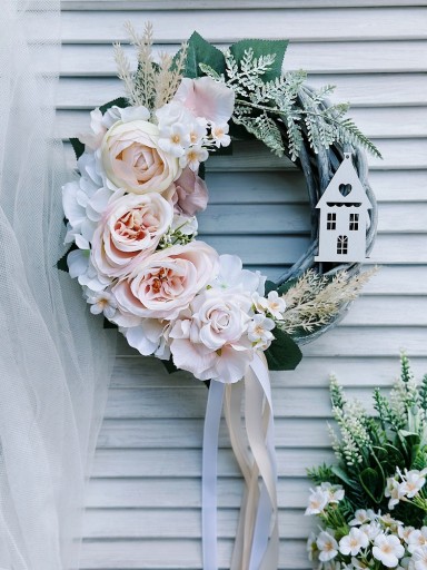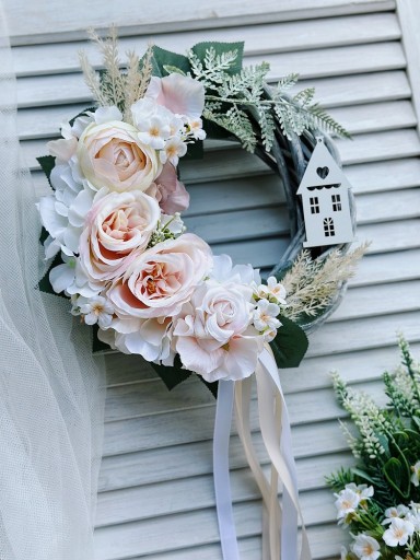 Wianek wiosenny, ozdobiony sztucznymi kwiatami w kremowych i pudrowych odcieniach oraz różnorodnymi dodatkami, liśćmi i kokardką.