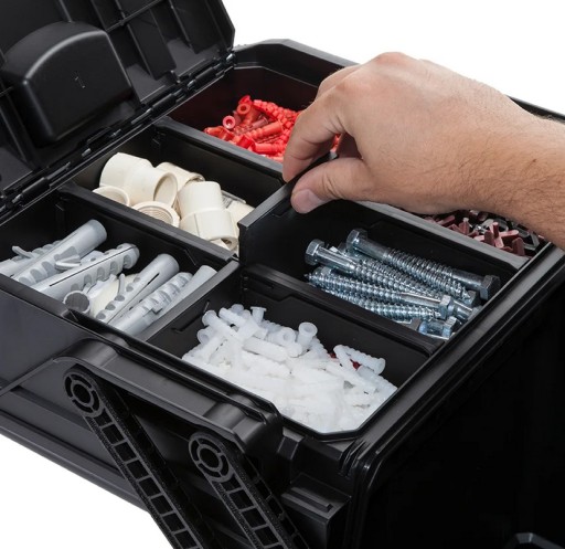 - Skrzynka Job Box posiada centralny system blokujący, który utrzymuje zawartość w stabilnym położeniu