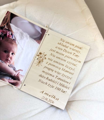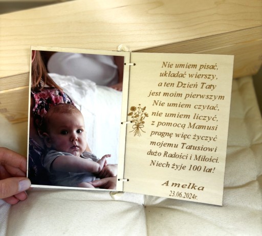 Pamiątka z okazji pierwszego dnia taty. Otwierana kartka z życzeniami i miejscem na zdjęcie.