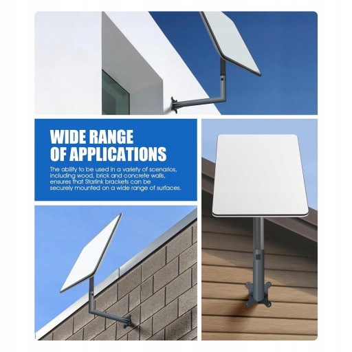 3. SZEROKI ZAKRES ZASTOSOWANIA: Zestaw montażowy Starlink jest uniwersalny i nadaje się do montażu na okapach i różnych powierzchniach, takich jak ściany drewniane, ceglane i betonowe. Zapewnia elastyczność w znalezieniu najlepszej lokalizacji i ustawieniu anteny satelitarnej.