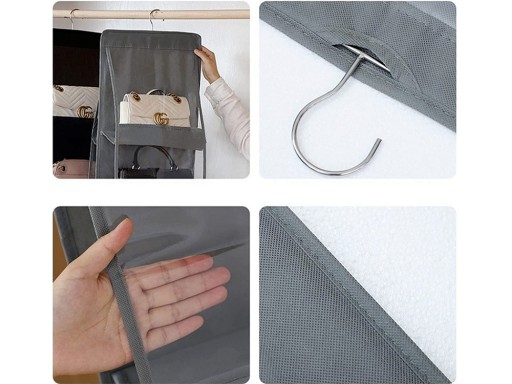 Organizer posiada 8 przezroczystych kieszeni, w których możesz pomieścić nawet do 16 torebek. Dodatkowo w zestawie znajduje się metalowy wieszak do zawieszenia.