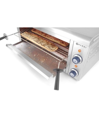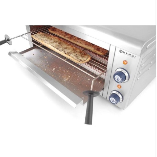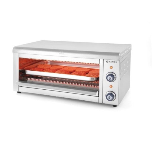 Nazwa producenta: Hendi 264409 Opiekacz kwarcowy z możliwością umieszczania w komorze tac GN 1/1 marki Hendi to uniwersalne urządzenie, które znajdzie zastosowanie zarówno w małej gastronomi (np. w lokalach typu fast food czy na stacjach benzynowych), jak i również w domowych kuchniach, szkolnych stołówkach lub jadalniach w zakładach pracy. Doskonale sprawdzi się podczas podgrzewania lub grillowania żywności. Grzałki kwarcowe na podczerwień umieszczone są na górze i dole komory, co umożliwia równomierne podgrzewanie żywności z obu stron. Dodatkowo, w celu zwiększenia komfortu pracy z urządzeniem, urządzenie zostało wyposażone w termostat, timer oraz lampkę kontrolną. Cechy i funkcje: