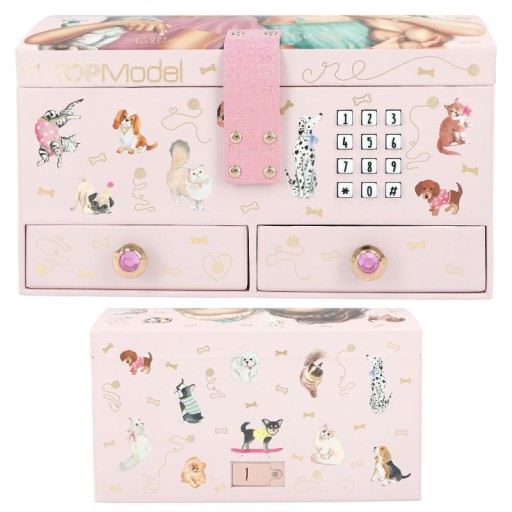 Na małe skarby i tajemnice: Pudełko na biżuterię od TOPModel otwiera się dopiero po wprowadzeniu prawidłowego kodu (ustawianego osobiście), a następnie odtwarza hitowy dreszcz przez około 20 sekund. Wewnątrz szkatułka na biżuterię posiada wyjmowaną wkładkę z trzema przegródkami i dwiema szufladami. Na zewnątrz w kolorze jasnoróżowym, z uroczymi kotami i psami oraz fantastycznym motywem dwóch modeli na uchylnej pokrywie. Baterie w zestawie i wymienne.