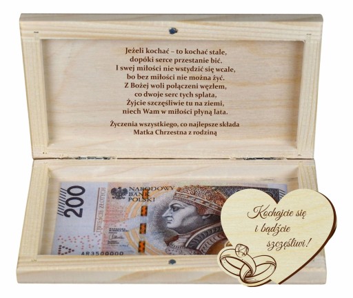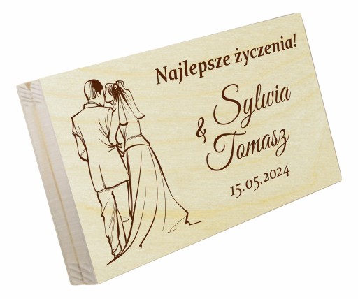 Chcesz elegancko wręczyć prezent w postaci gotówki? Mamy dla Ciebie rozwiązanie - pudełko na pieniądze na ślub, wesele, dla młodej pary, grawerowane pudełko jest idealnym prezentem. Prezent 3 w jednym: etui na banknoty, życzenia zastępujące kartkę oraz pudełko, które będzie pamiątką może służyć jako pudełko na drobiazgi.