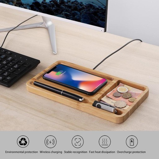 Bezprzewodowa ładowarka 2 w 1 z drewna bambusowego, mata do ładowania, organizer na biurko, taca do przechowywania