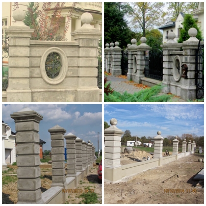 Dzięki temu że elementy, czyli słupy i murki dolne są jednorodną bryłą, montaż jest bardzo szybki i nikomu nie powinien sprawić problemu, w porównaniu np. z elementami modułowymi, gdzie każdy element należy oddzielnie zalewać i spoinować. Wystarczy jedynie wylać miejscowe stopy . Na tych że stopach ustawiamy słupy i murki, zalewając jedynie środek słupka, łączenia należy zasylikonować uszczelniaczem dekarskim, a daszki przykleić na klej mrozoodporny