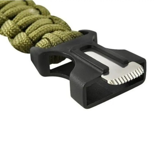 - 5 funkcji: kompas, ostrze (wewnątrz klamry), krzesiwo z magnesium, gwizdek ratunkowy, linka paracord
