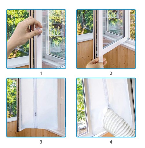 🔷🔷 【ŁATWA INSTALACJA】 - NIE MA POTRZEBY WIERCENIA OTWORÓW. Nie ma potrzeby stosowania zestawów okiennych, wszystko, czego potrzebujesz, jest dostarczane z uszczelką okienną! Wystarczy przykleić samoprzylepną taśmę z haczykami do ramy okna i kieszeni okiennej. Przymocuj uszczelkę okienną do taśmy z haczykami. Następnie rozpakuj uszczelkę okienną i umieść wąż klimatyzatora przez okno. Na koniec zapnij szczelnie zamek błyskawiczny wokół węża.