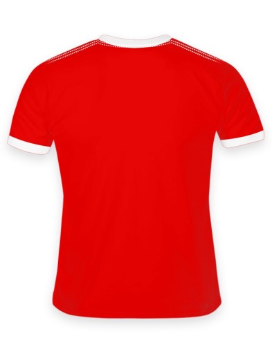 Oprócz naszych stałych dodatków w postaci firmowych żakardów, koszulkę urozmaicają biała tasiemka wzmacniająca górną część koszulki, obszyta również białą nicią, metodą podwójnego ściegu łańcuszkowego. Koszulkę uzupełnia czerwony potnik, a także kontrastujące z dominującym kolorem materiału, białe krańce rękawków oraz kołnierzyk.